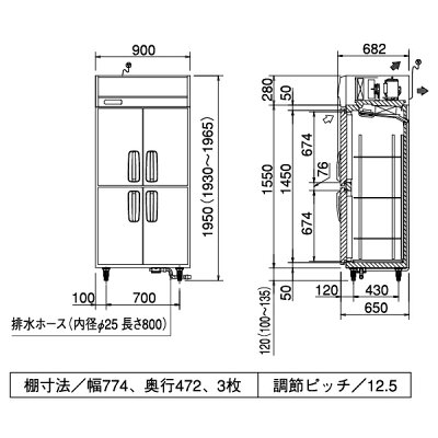 仕 様 【メーカー】パナソニック 【型 番】SRR-K961S 【電 源】単相100V (50/60Hz) 【外形寸法】幅900×奥行650×高さ1950(mm) 【内形寸法】幅800×奥行550×高さ1450(mm) 【庫内温度】-6℃〜12℃ 【有効内容積】611リットル 【内 装】ステンレス鋼板 【台 脚】樹脂製、調節範囲100〜135mm 【消費電力】冷却時179/179W 霜取時324/324W 【製品質量】94kg 【付属品】棚3枚、底敷1枚、棚受15個、排水(フレキシブル)ホース1本 【備 考】ガラス扉タイプ、三相電源タイプ、ピラー有りタイプは受注生産となります。