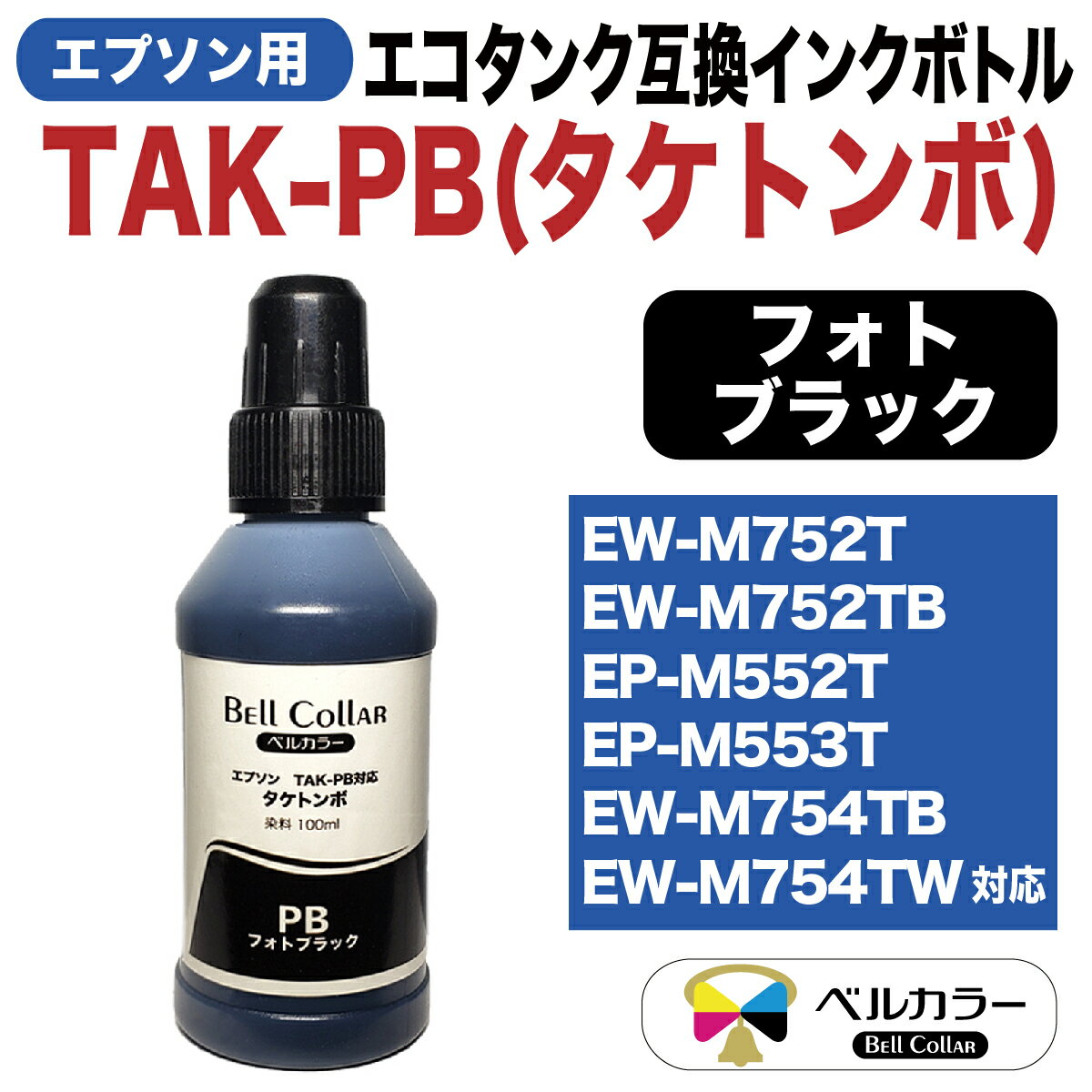 【セット内容】フォトブラック(PB) / シアン(C) / マゼンタ(M) / イエロー(Y) いずれか 100ml ボトル1本 【対応プリンター機種】 EW-M752T / EW-M752TB/ EP-M552T 【対応型番】 タケトンボ TAK-PB / TAK-PB-L ベルカラーの製品は、ISO9001及び、ISO14001の認定を受けた工場で生産されている品質の高い製品です。