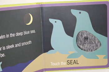 特殊な素材が動物の体の一部に貼ってあり、触って感じる絵本です。