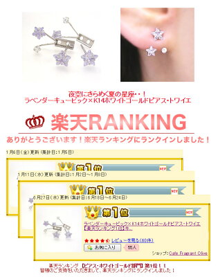 おすすめコーディネート ショートヘアや、タイトなまとめ髪など、 頭の高い位置にポイントのあるヘアスタイルにすると、 ピアスがはえて、バランスよくきまりますよ! 遊び心あふれるこんなピアスなら、 デートやパーティーがもっと楽しくなりそう! 石 ラベンダーキュービック キュービックジルコニア 色 ラベンダー クリスタル 材質 K14ホワイトゴールド キャッチ K14ホワイトゴールド 大きさ バックピアス全長12×8mm ラベンダーキュービックジルコニア5mm/4mm キュービックジルコニア2mm ポスト 9mm 品番 P3316夜空にきらめく夏の星座・・! ラベンダーキュービック×K14ホワイトゴールドピアス・トワイエ 楽天ランキング 【ピアス・ホワイトゴールド部門】 第1位!! 皆様のご支持をいただきまして、楽天ランキングにランクインしました! ロマンチックな夏の夜空に、 キラキラ輝く星がかわいい・・! たっぷり5ミリの大きな星の下に、 小さな星が2つきらめく キュートなピアスをおつくりしました! やさしいラベンダーの色合いが映える、 いま人気のバックピアスタイプです! バックピアスには4ミリの星と、 小さくまる〜いクリアキュービックの星ひとつ。