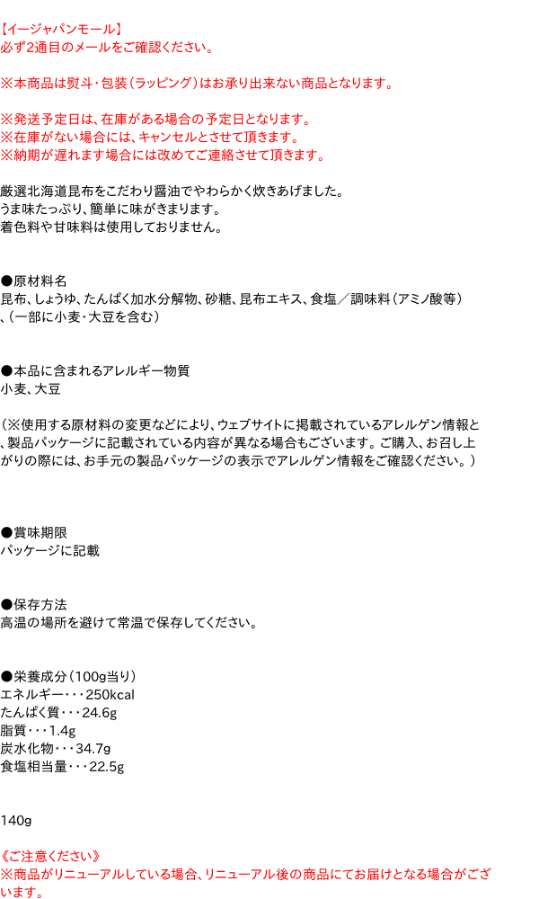 ●原材料名 昆布、しょうゆ、たんぱく加水分解物、砂糖、昆布エキス、食塩/調味料(アミノ酸等)、(一部に小麦・大豆を含む) ●本品に含まれるアレルギー物質 小麦、大豆 (※使用する原材料の変更などにより、ウェブサイトに掲載されているアレルゲン情報と、製品パッケージに記載されている内容が異なる場合もございます。